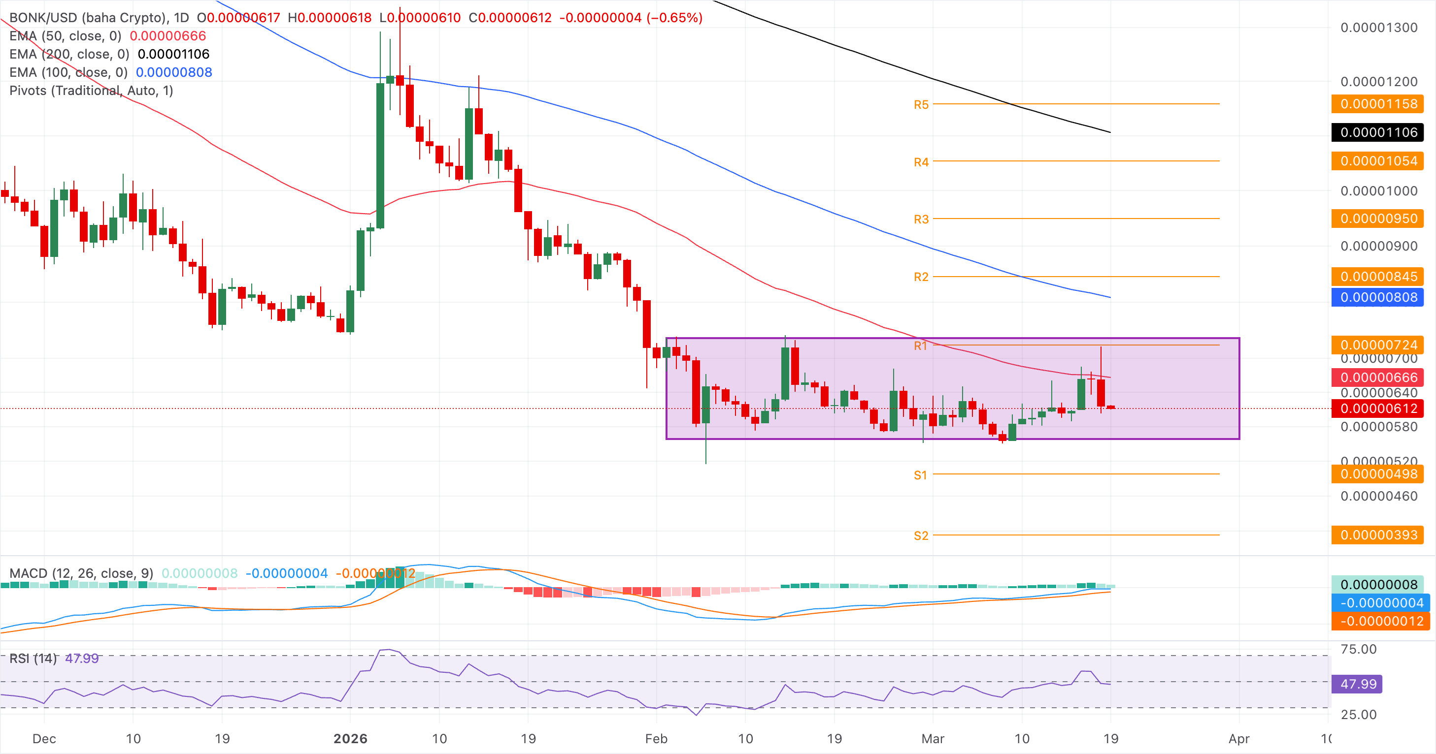 Bonk se mantiene estable por encima de 0.00000600 en el momento de escribir el jueves, tras una caída del 7% el día anterior. El trasfondo técnico es neutral con una ligera inclinación a la baja, ya que $BONK se revierte dentro de un rango de consolidación mientras que las EMA de 50, 100 y 200 días descienden, manteniendo la inclinación general bajista.