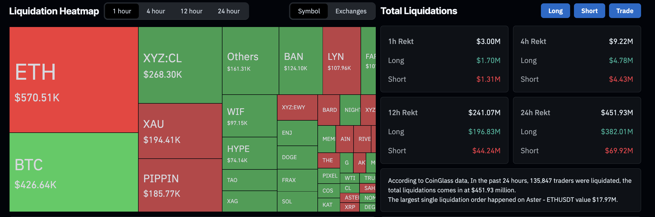 Reaccionando al retraso en las reducciones de tasas, el mercado de criptomonedas registró liquidaciones masivas en las últimas 24 horas, totalizando 451,93 millones de dólares, impulsadas principalmente por liquidaciones largas de 382,01 millones de dólares, reflejando una presión a la baja renovada.