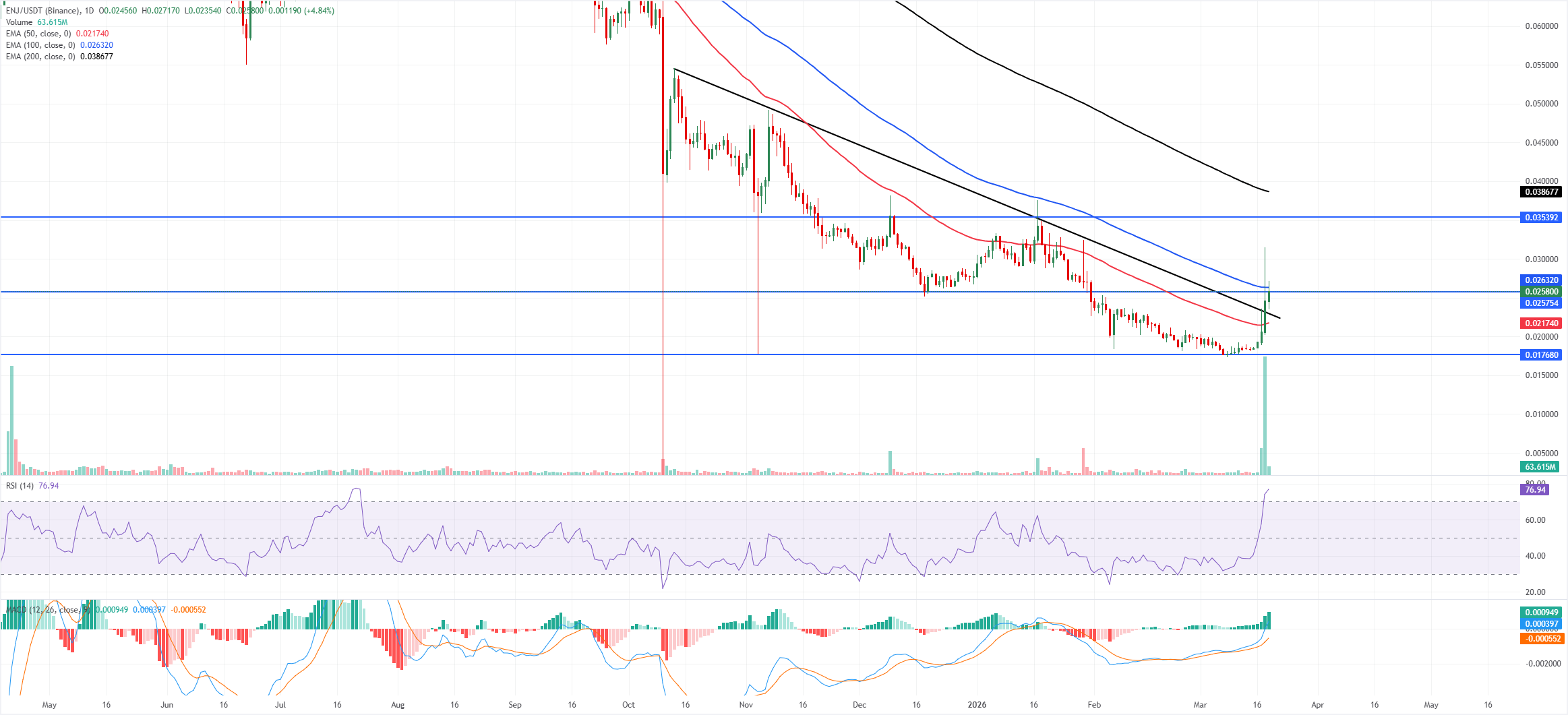El Índice de Fuerza Relativa (RSI) diario ha entrado en territorio de sobrecompra por encima de 70, y la línea de Convergencia/Divergencia de Medias Móviles (MACD) se sitúa por encima de su señal y por encima de la línea cero, señalando un fuerte impulso al alza a pesar de que $ENJ todavía se cotiza muy por debajo de las Medias Móviles Exponenciales de 100 días y 200 días agrupadas cerca de 0.026$ y 0.038$, respectivamente, que continúan limitando la tendencia bajista más amplia.