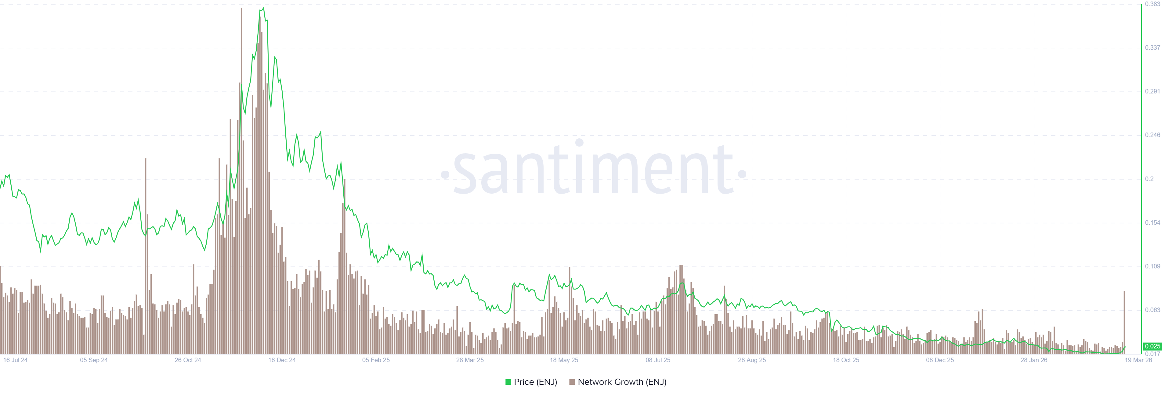 Los datos de Santiment muestran que el índice de crecimiento de la red de Enjin Coin —una métrica clave que rastrea la adopción de usuarios y la tracción del proyecto— se disparó a 71 el jueves desde 14 el día anterior, el nivel más alto desde el 14 de agosto de 2025. Estos niveles elevados aún destacan una perspectiva en general alcista para $ENJ.