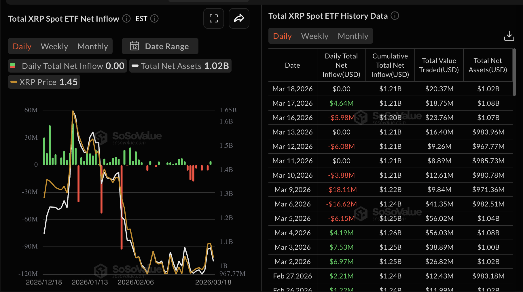 El interés relacionado con instituciones sigue siendo inestable, como lo refleja la actividad moderada en los fondos cotizados (ETF) de $XRP al contado el miércoles. Los datos de SoSoValue muestran que los ETF listados en EE.UU. registraron flujos cero, dejando los flujos acumulados en 1.21 mil millones de dólares y los activos totales bajo gestión en 1.02 mil millones de dólares.