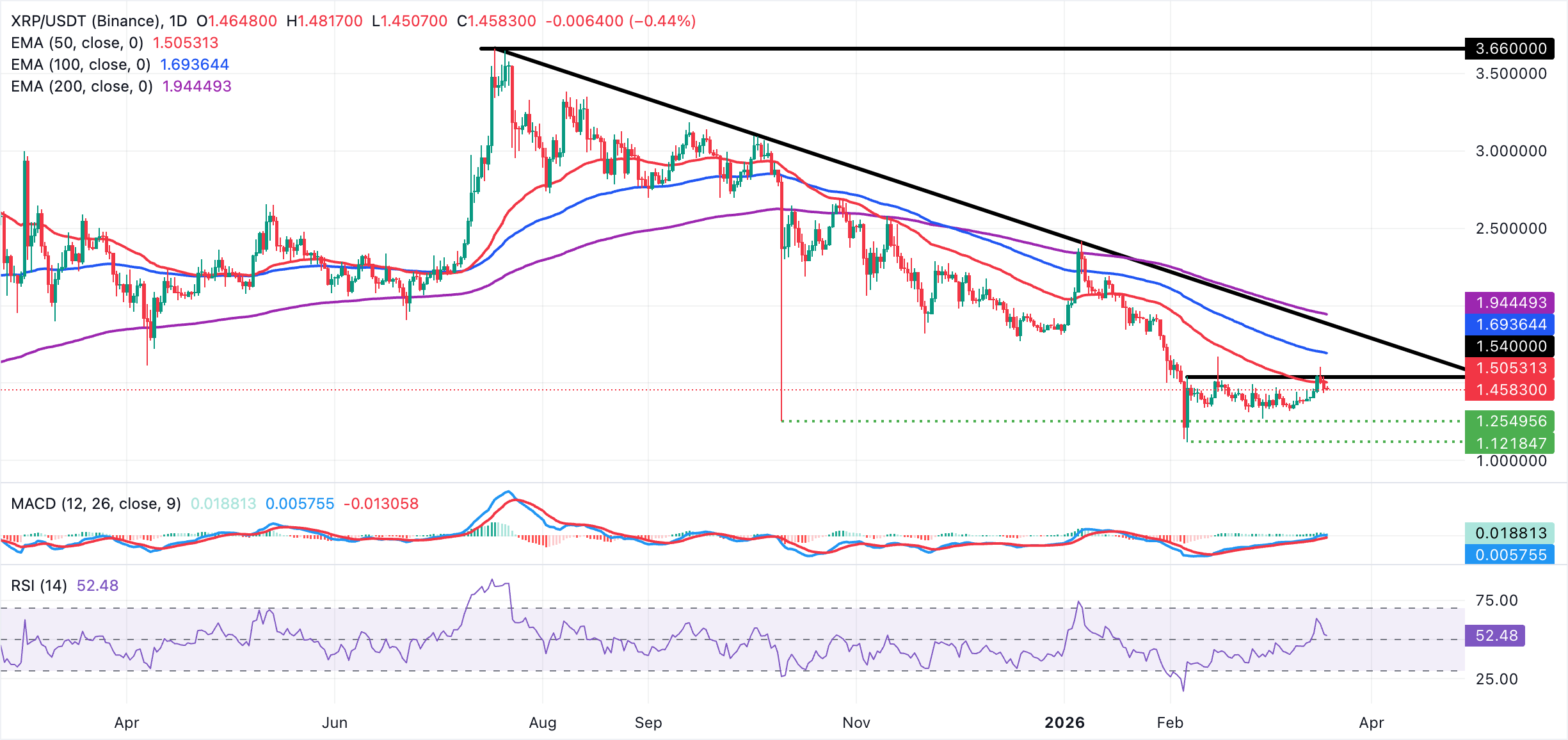 $XRP cotiza alrededor de 1.46$ en medio de una perspectiva neutral a bajista mientras el precio extiende su caída desde el máximo semanal de 1.61$. El token de remesas se sitúa por debajo de una secuencia de medias móviles descendentes, con la media móvil exponencial (EMA) de 50 días cerca de 1.51$, la EMA de 100 días alrededor de 1.69$ y la EMA de 200 días cerca de 1.94$, lo que confirma una tendencia bajista más amplia.