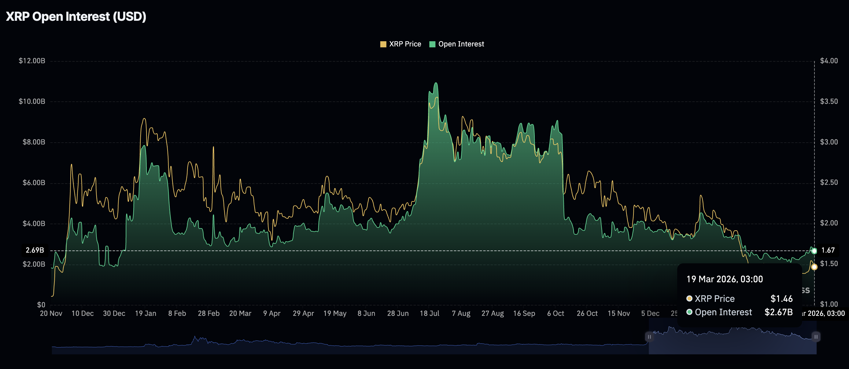 El mercado de derivados de $XRP enfrenta nuevamente una caída en el interés minorista, ya que el Open Interest (OI) de futuros, que refleja el valor nocional de los contratos de futuros pendientes, se reduce a 2.67 mil millones de dólares el jueves desde 2.79 mil millones de dólares el día anterior.