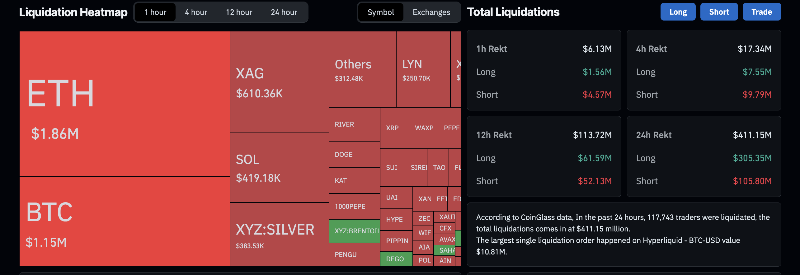 El sentimiento general del mercado de criptomonedas ha caído con el Bitcoin retrocediendo a 70.000$ el viernes. El Índice de Miedo y Codicia de CoinMarketCap está en 31, lo que sugiere que los inversores están dominados por el miedo. Además, los datos de CoinGlass muestran más de 411 millones de dólares eliminados del mercado en las últimas 24 horas, incluyendo 305 millones de dólares en liquidaciones largas, lo que sugiere un sesgo bajista.