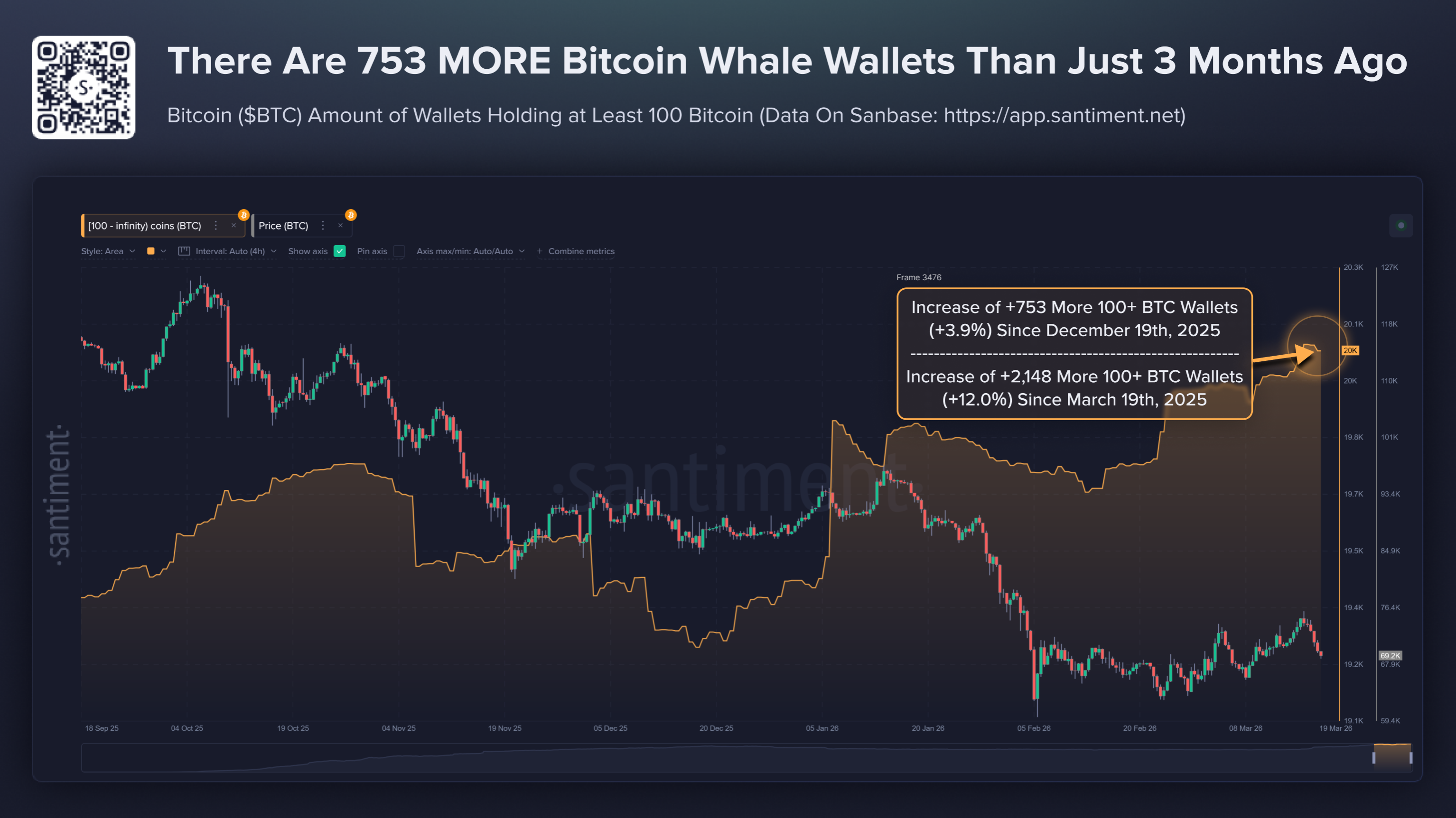 Aun así, el número de carteras ballena que poseen más de 100 Bitcoin ha aumentado un 3.9% desde el 19 de diciembre y un 12% desde el 19 de marzo de 2025, reflejando una fuerte confianza entre los holders de diamante a pesar de las tensiones en Oriente Medio.