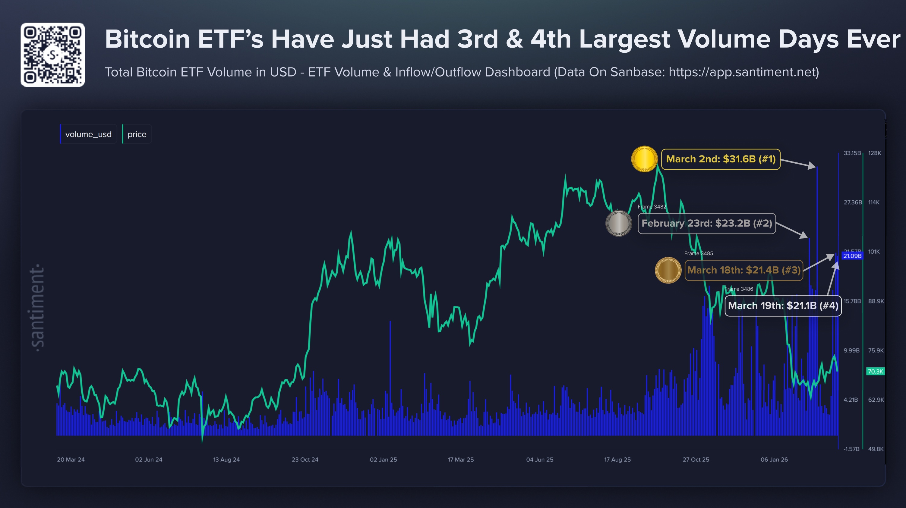 Mientras tanto, los fondos cotizados en bolsa (ETF) centrados en Bitcoin han registrado volúmenes masivos durante la última semana, con volúmenes diarios de 21.400 millones de dólares y 21.100 millones de dólares en los últimos dos días, marcando su tercera y cuarta mayor colección de volumen hasta la fecha. Este aumento repentino en el volumen de negociación coincide con el aumento de la volatilidad, ya que la guerra entre EE.UU. e Irán exige una participación activa de los ETF.