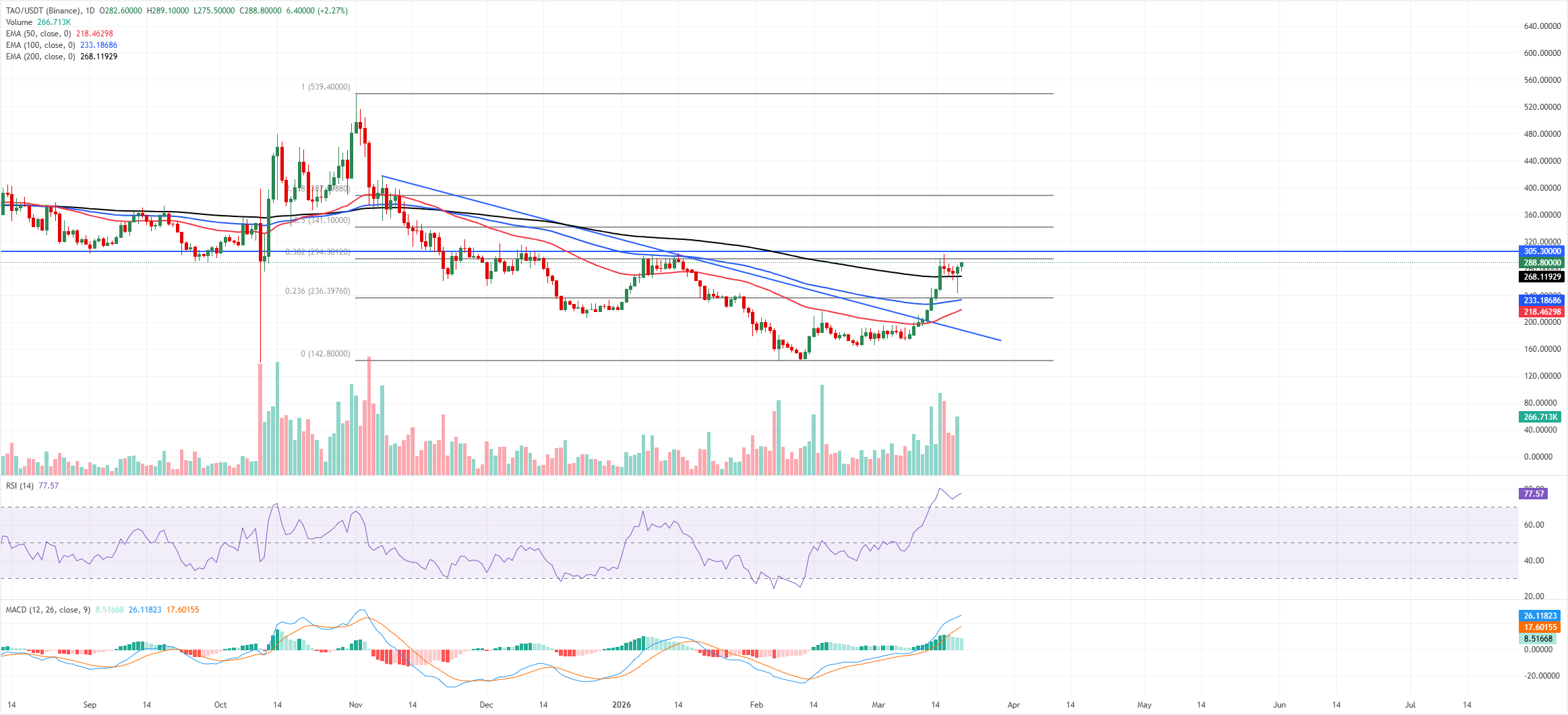 Bittensor cotiza por encima de 289$ al viernes, con un aumento de más del 15% hasta ahora esta semana. El sesgo a corto plazo es alcista tras recuperar la línea de tendencia descendente rota, con $TAO manteniéndose bien por encima de las medias móviles exponenciales (EMA) de 50, 100 y 200 días, que se agrupan entre aproximadamente 218$ y 268$ y sustentan el avance.