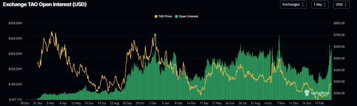 Además, los datos de CoinGlass muestran que el interés abierto (OI) en futuros en los exchanges para Bittensor alcanzó los 361.15 millones de dólares el lunes, desde 131.94 millones de dólares el 4 de marzo, niveles no vistos desde principios de noviembre, y ha ido aumentando de forma constante hasta alrededor de 331.95 millones de dólares el viernes. Un interés abierto creciente representa dinero nuevo o adicional entrando al mercado y nuevas compras, lo que podría alimentar el actual repunte del precio de $TAO.