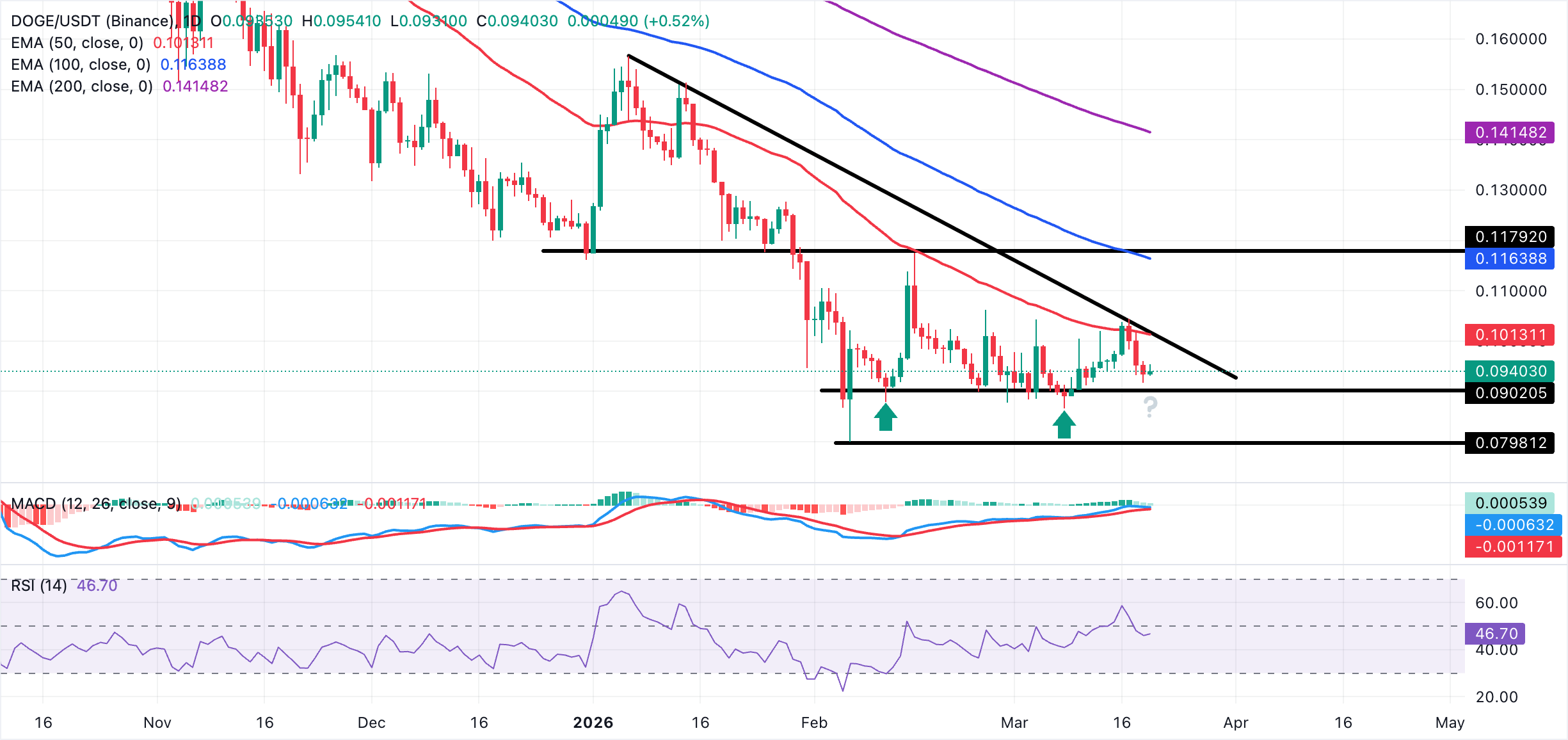 Dogecoin se mantiene alrededor de la apertura diaria de 0.0935$ tras corregir desde el máximo semanal de 0.1045$. El sesgo a corto plazo sigue siendo ligeramente bajista ya que el precio se mantiene muy por debajo de las medias móviles exponenciales (EMAs) de 50, 100 y 200 días, que todas tienen pendiente descendente y señalan una tendencia bajista dominante más amplia.