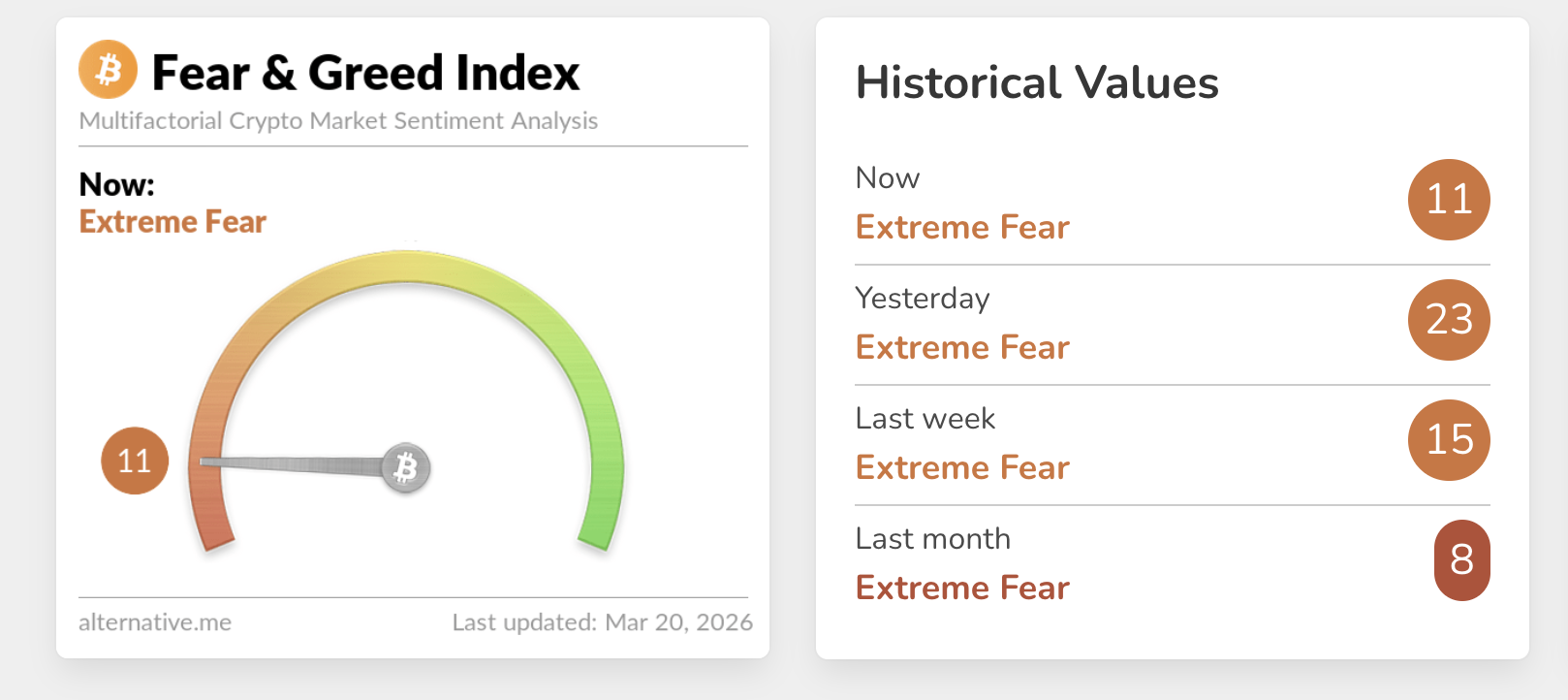 Mientras los precios del petróleo y la energía se dispararon, el Oro, la Plata y los activos de riesgo como las criptomonedas y las acciones cayeron, reflejando un creciente sentimiento de aversión al riesgo en los mercados globales. El índice de Miedo y Codicia cayó a 11 el viernes, en territorio de miedo extremo, desde 23 el día anterior.