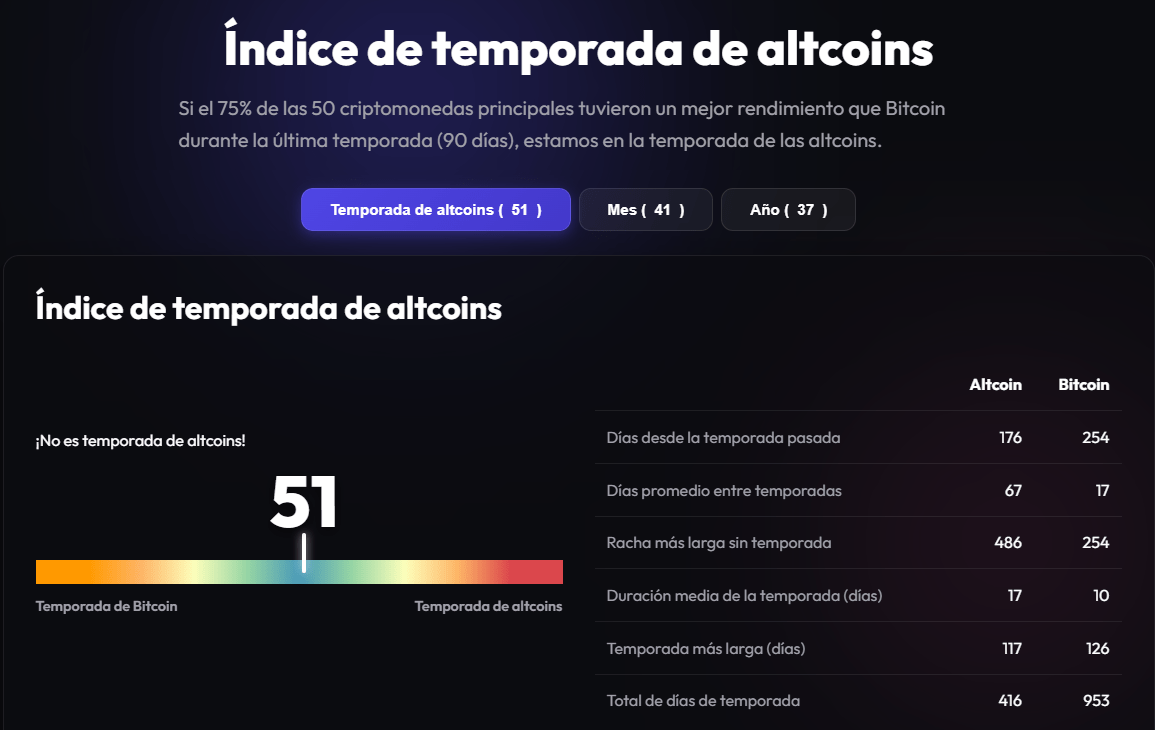 Este escenario se ve alimentado por factores macroeconómicos que bloquean el inicio de una nueva altseason. La persistencia de tasas de interés elevadas y las tensiones energéticas en Oriente Medio han erosionado el apetito por las altcoins, mientras que el Índice Altcoin Season se sitúa en apenas 51 puntos, lejos del umbral de 75 necesario para un cambio de tendencia.