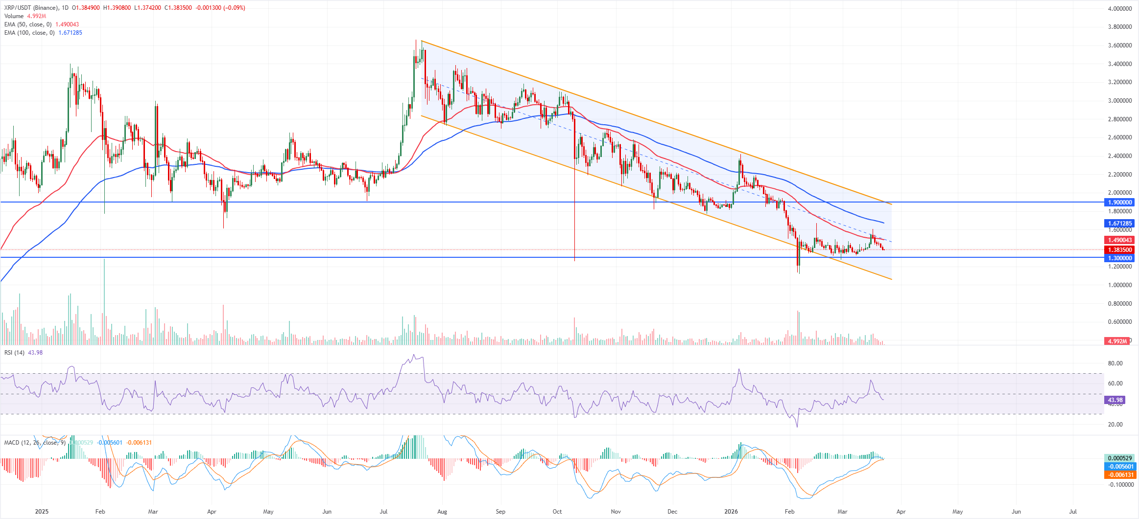 El precio de $XRP cotiza por debajo de 1.39$ al momento de escribir el lunes. $XRP permanece encerrado dentro de un canal paralelo descendente anclado desde 2.83$, con el precio más cerca del límite inferior cerca de 1.09$ que de la línea superior alrededor de 1.90$, manteniendo el tono general bajista. Los cierres diarios se mantienen muy por debajo de las EMAs de 50 y 100 días agrupadas entre 1.49$ y 1.67$, reforzando la presión a la baja ya que los repuntes no logran desafiar estas capas de resistencia dinámica.