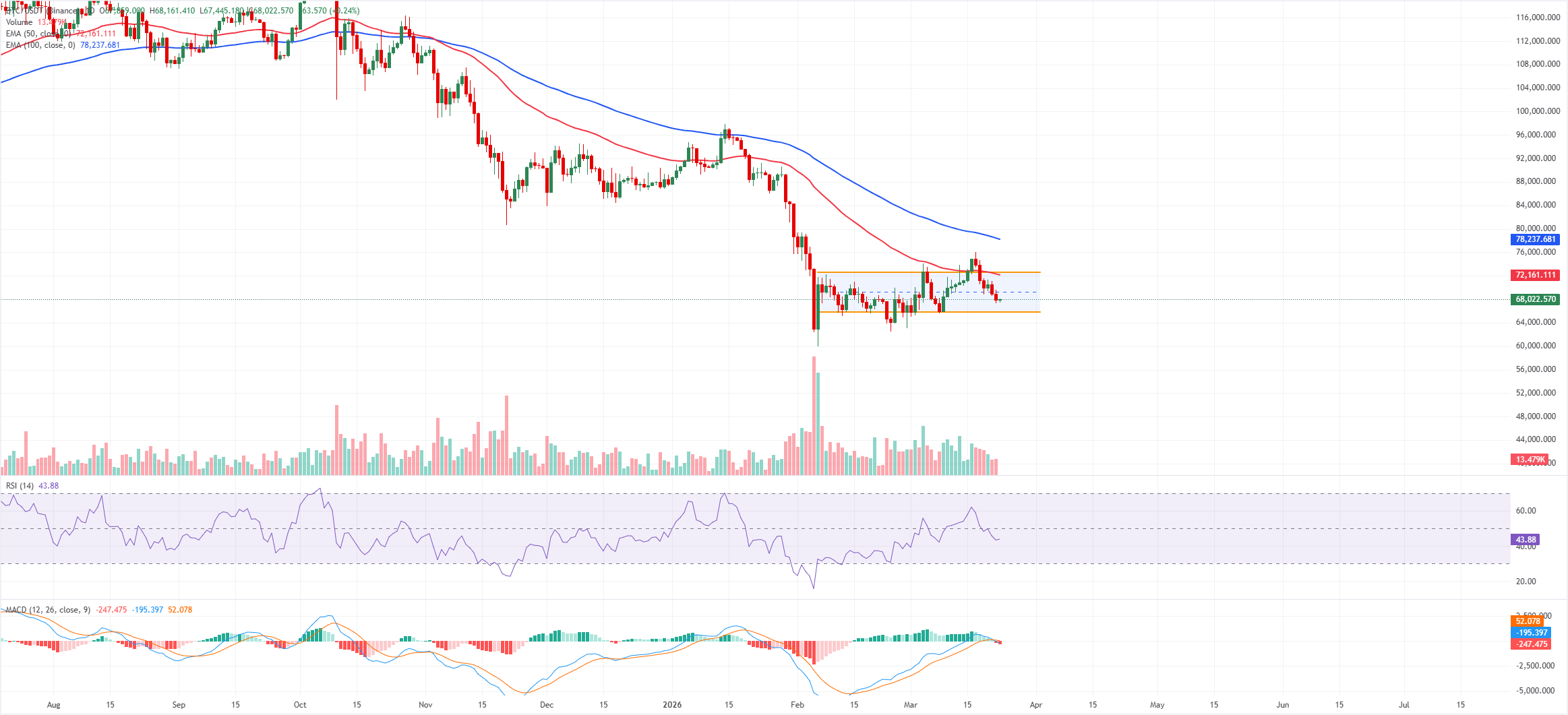 El precio del Bitcoin cotiza en 68.000$ a fecha del lunes. El sesgo a corto plazo se vuelve ligeramente bajista ya que el precio se mantiene por debajo del límite superior del canal cerca de 72.600$ mientras respeta la banda inferior alrededor de 65.900$, indicando que los vendedores dominan en los repuntes dentro de la estructura descendente. Los cierres diarios permanecen muy por debajo de las medias móviles exponenciales (EMAs) de 50 y 100 días agrupadas por encima de 72.000$–78.000$, subrayando una fase correctiva dentro de un rango amplio de alto nivel.