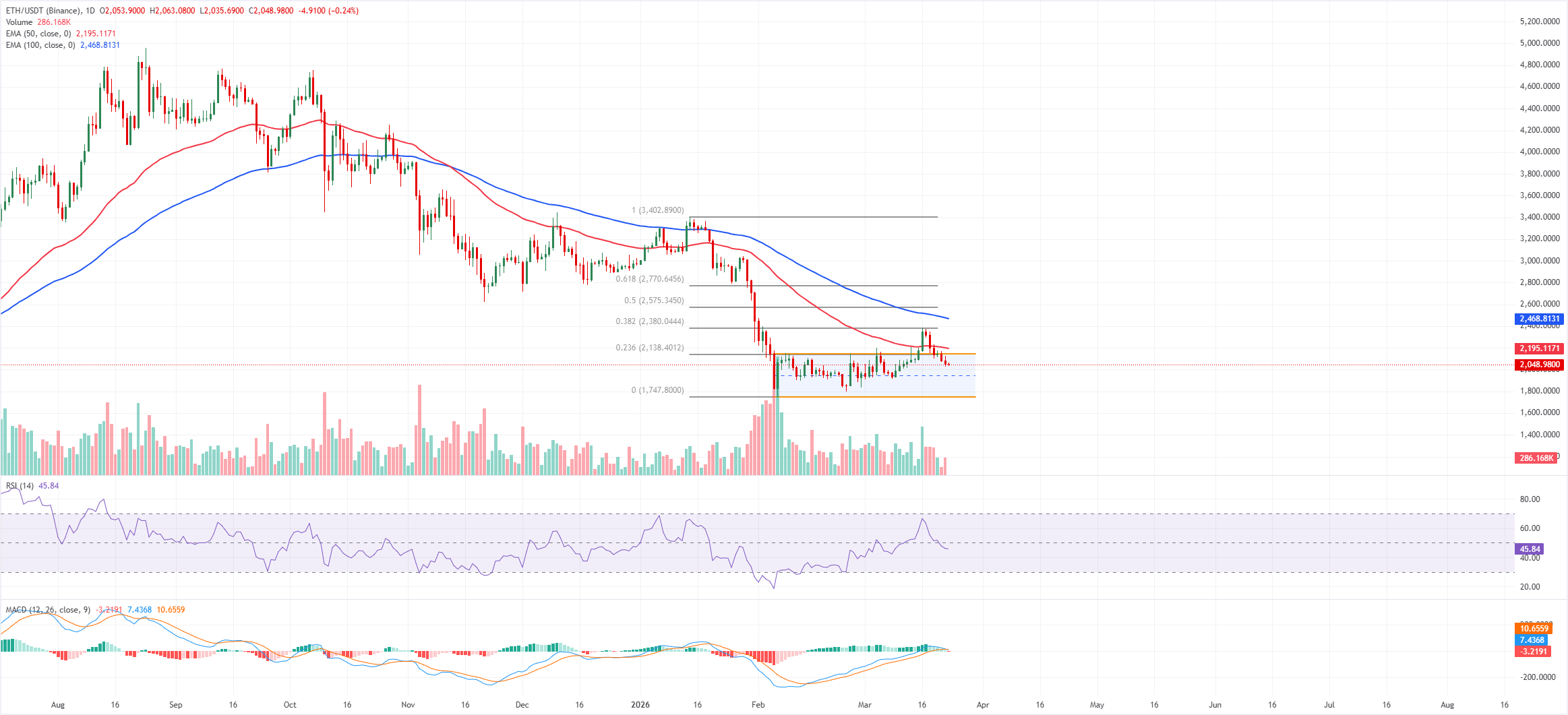 La resistencia inicial surge en la parte superior del canal cerca de 2.148$, con el retroceso de Fibonacci del 23.6% desde el mínimo de 1.747,80$ hasta el máximo de 3.402,89$ en 2.138$ añadiendo peso a esta barrera. Un cierre diario por encima de esta zona expondría el retroceso del 38.2% en 2.380$, alineando a $ETH con la región de la EMA de 50 días y debilitando la estructura bajista actual.