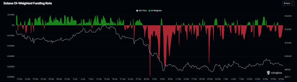 Además, los datos de las tasas de financiación de CoinGlass también respaldan un sentimiento negativo. La métrica cambió a una tasa negativa el sábado y marca -0.0011% el lunes, lo que indica que los cortos están pagando a los largos y sugiere un sentimiento bajista hacia $SOL.