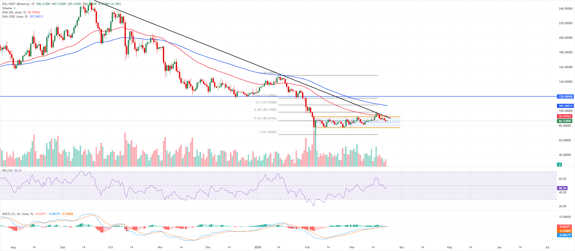 En el lado bajista, el soporte inmediato se alinea con el piso del canal cerca de 77.12$, seguido por la región de origen de Fibonacci alrededor de 67.50$, donde una ruptura anularía la estructura de consolidación y cambiaría el enfoque de nuevo a la tendencia bajista más amplia definida por los niveles de retroceso más altos en 38.2% (98.42$) y 50.0% (107.97$) que actúan como resistencia a mediano plazo en cualquier recuperación más fuerte.