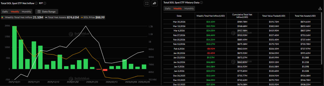 A pesar de los conflictos en curso, la demanda institucional de Solana se mantuvo robusta la semana pasada. SoSoValue registró una entrada de 21.10 millones de dólares la semana pasada, lo que representa la sexta semana consecutiva de flujos positivos. Sin embargo, si estos flujos se vuelven negativos en medio de la guerra en Oriente Medio esta semana, el precio de $SOL podría corregir aún más.