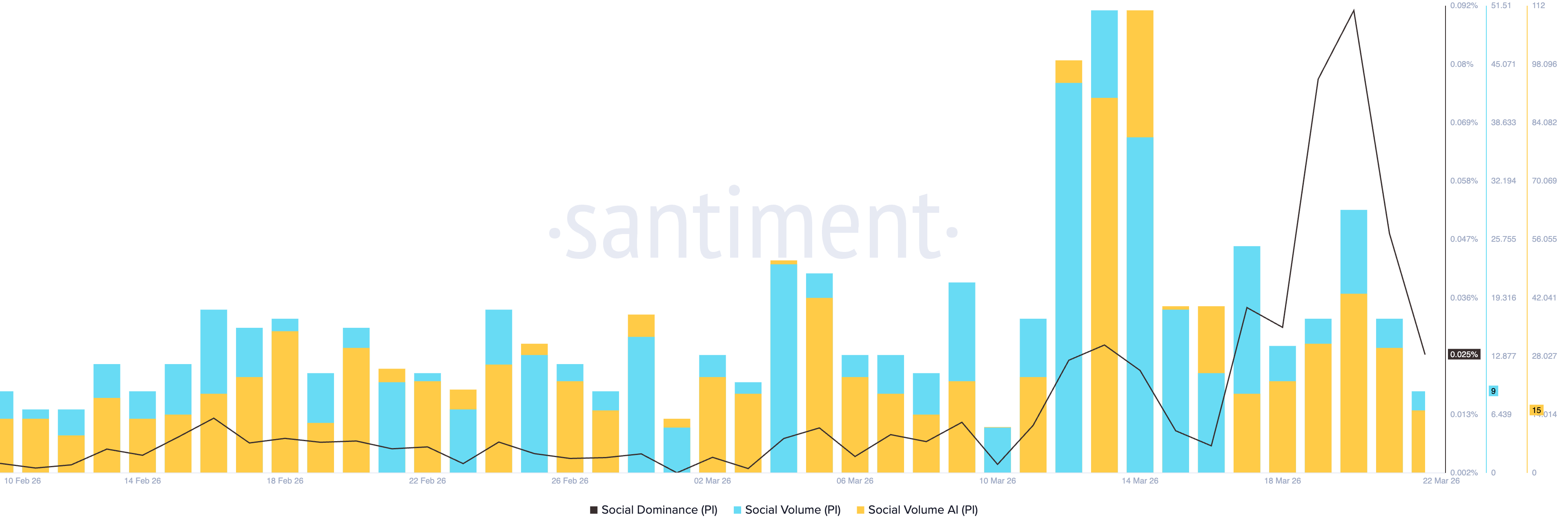 Los datos de Santiment muestran una caída repentina en la dominancia social de Pi Network al 0.025% entre las 100 principales criptomonedas. Típicamente, una caída en la exposición mediática de Pi Network señala un riesgo a la baja, ya que PI sigue siendo un token mayormente especulativo impulsado por su comunidad.