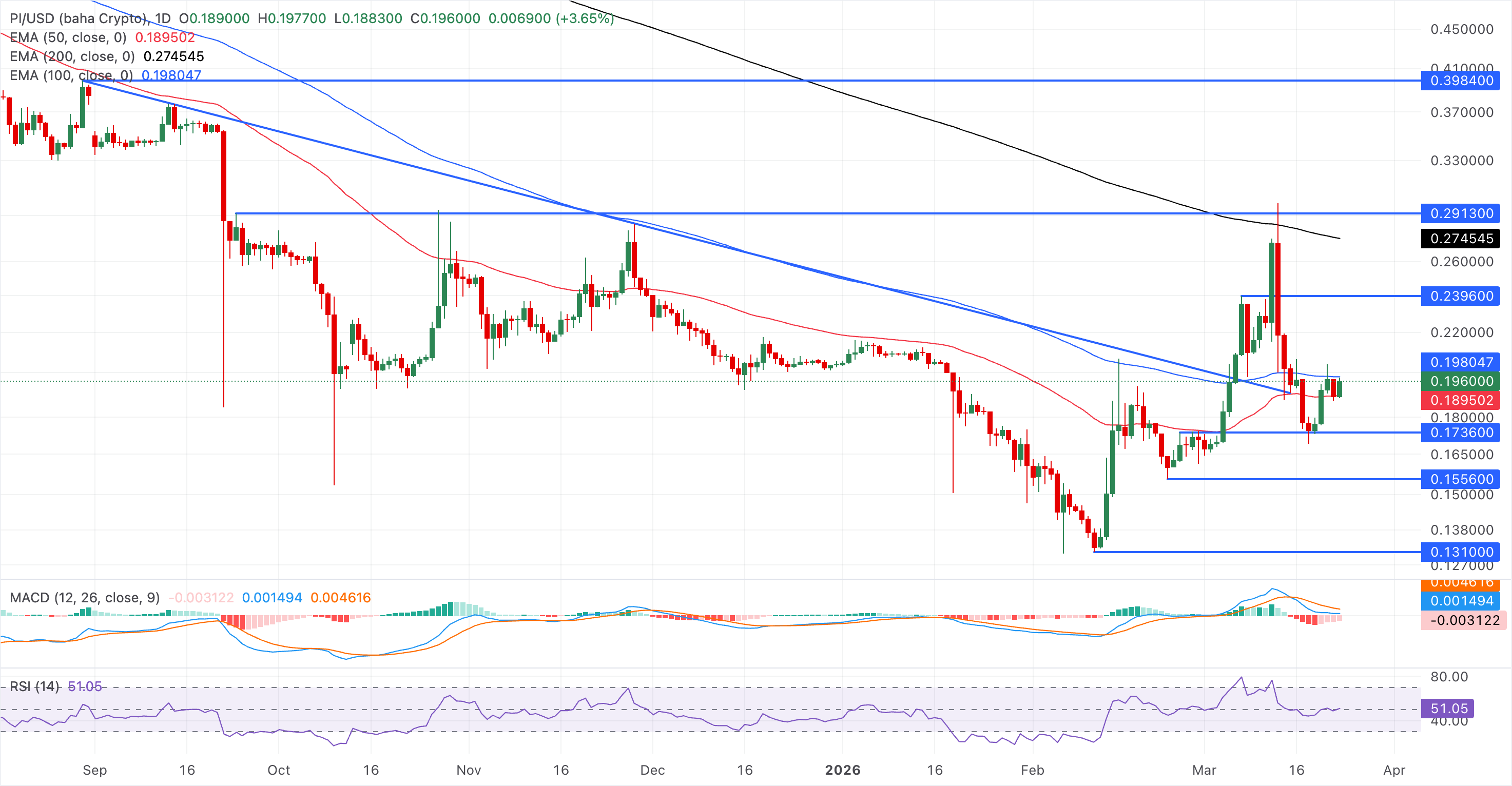 El soporte inmediato aparece en la EMA de 50 días cerca de 0.1895$, seguido por el nivel de soporte en 0.1736$ si la presión vendedora se extiende.