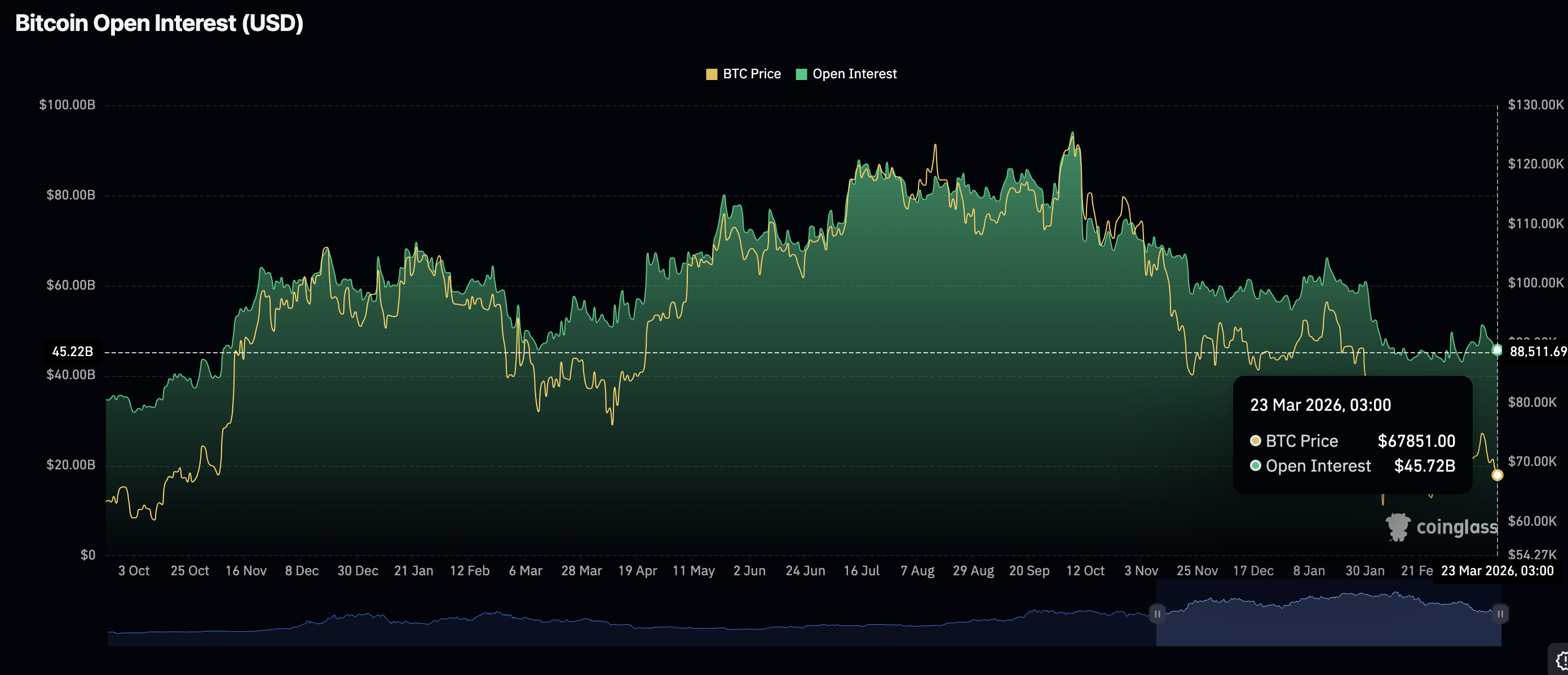 El valor nocional de los contratos de futuros pendientes está disminuyendo, como lo refleja el interés abierto (OI) de Bitcoin, que cayó a 45.730 millones de dólares el lunes, desde el pico de 51.290 millones de dólares de la semana pasada.