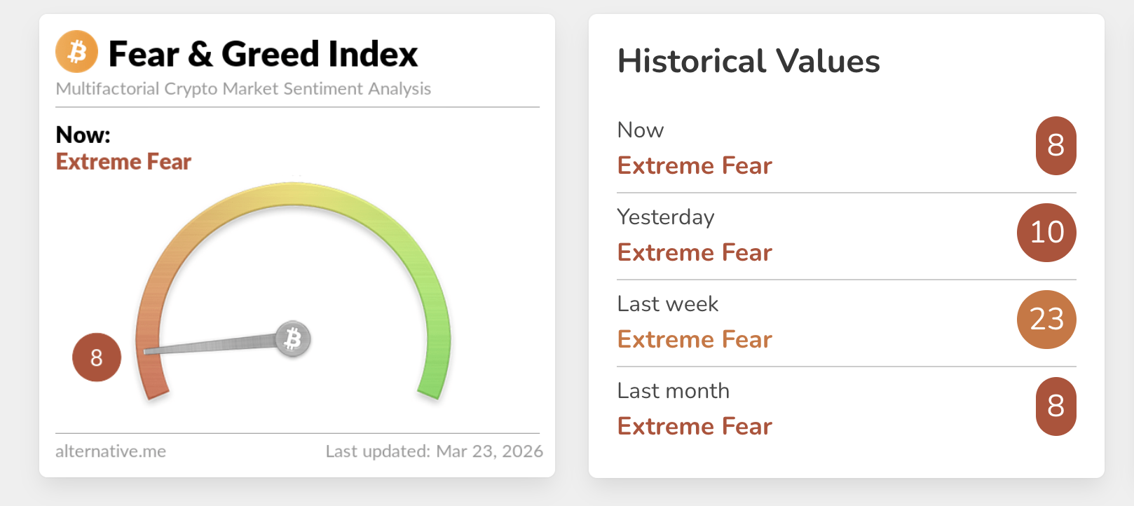 Mientras tanto, el interés en los activos cripto sigue a la baja, como se observa en el Índice de Miedo y Codicia, que cayó a 8 (miedo extremo) el lunes desde 10 el día anterior y desde el nivel de 23 de la semana pasada.