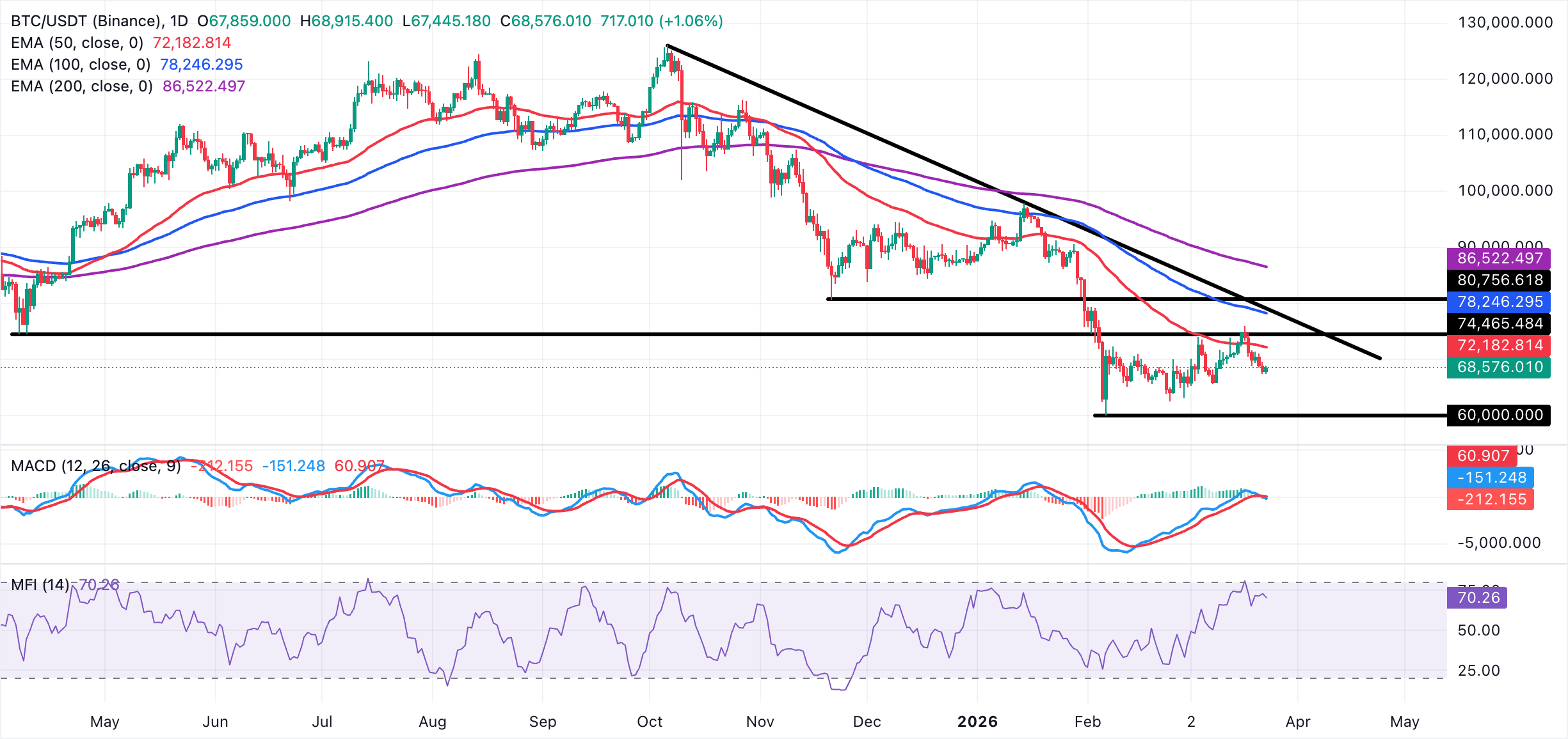 El Bitcoin cotiza por encima de los 68.500$, con una tendencia neutral a corto plazo y una inclinación técnica a la baja. El precio se mantiene muy por debajo de las medias móviles exponenciales (EMAs) agrupadas de 50, 100 y 200 días, que todas se sitúan por encima de los 72.000$ y enmarcan una tendencia bajista consolidada en un marco temporal superior.
