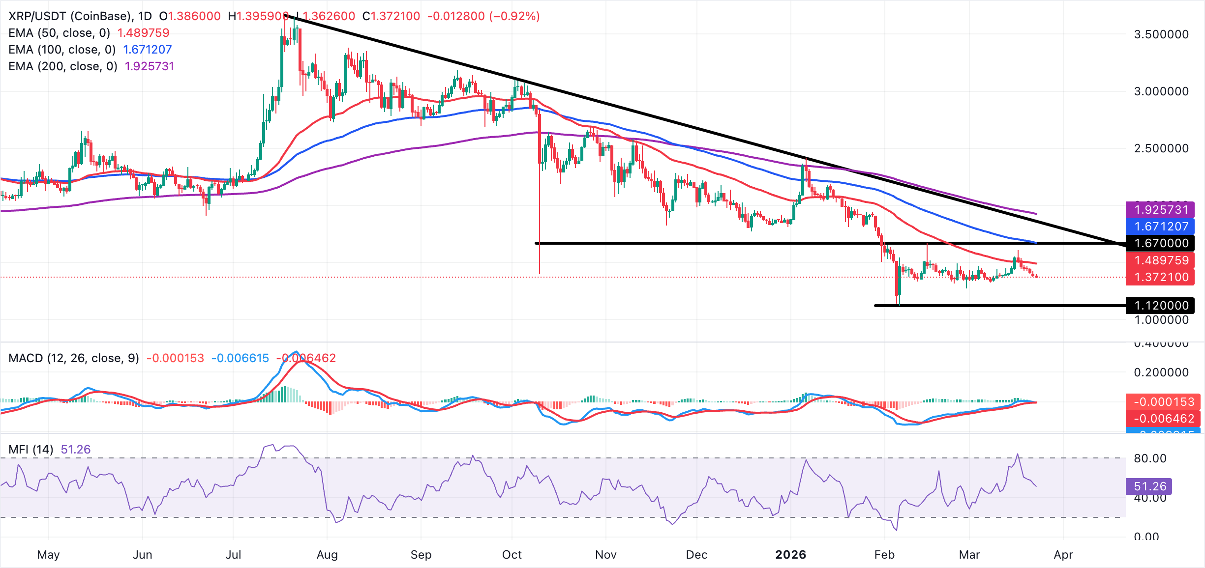 En cuanto a $XRP, la tendencia a corto plazo es ligeramente bajista ya que el precio continúa rondando muy por debajo de la línea de tendencia descendente. El token de remesas cotiza por debajo de las EMAs de 50, 100 y 200 días, que todas tienen pendiente descendente y limitan el alza. El indicador MACD ha caído por debajo de su línea de señal en el gráfico diario, mientras que el MFI retrocede desde la zona de sobrecompra por encima de 80 hacia los bajos 50. Juntos, estos indicadores sugieren un impulso alcista decreciente y un mercado vulnerable a una mayor presión correctiva.