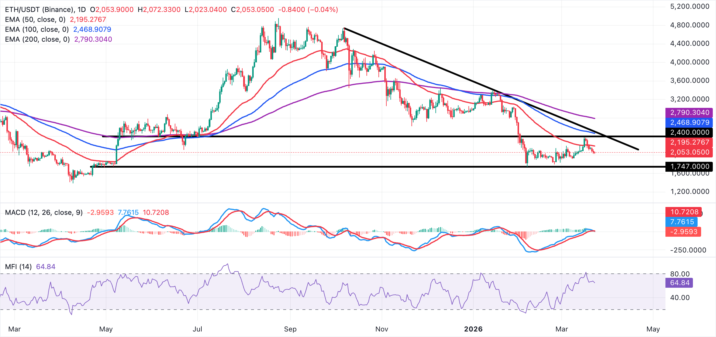 Ethereum cotiza cerca del soporte en 2.000$ pero se mantiene muy por debajo de la línea de resistencia descendente que ha limitado los intentos de recuperación desde la zona de 4.700$, y sigue consolidado por debajo de las EMAs de 50, 100 y 200 días.