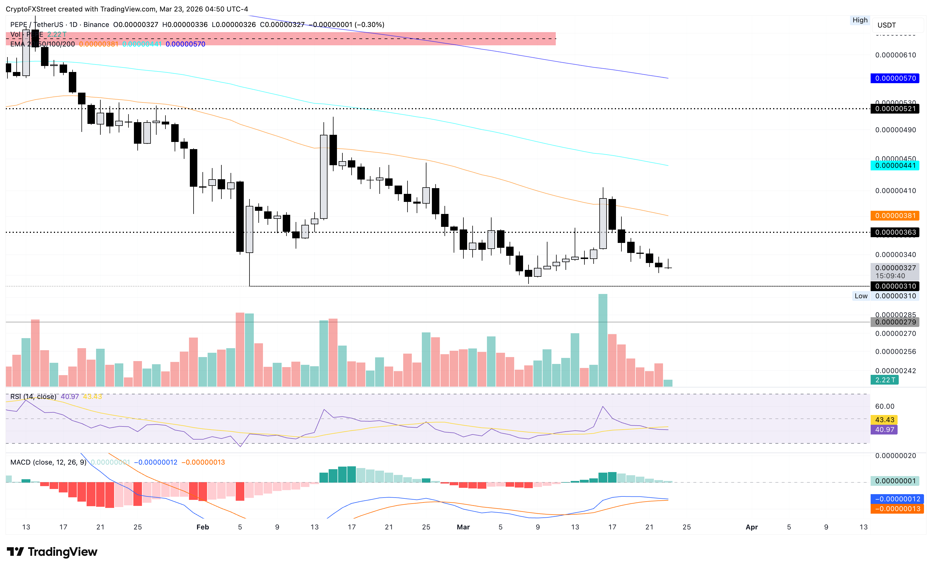 En el lado alcista, cualquier rebote en $PEPE debería superar la EMA de 50 días en 0.00000381$ para una tendencia ascendente sostenida, que podría apuntar a la EMA de 100 días en 0.00000441$.