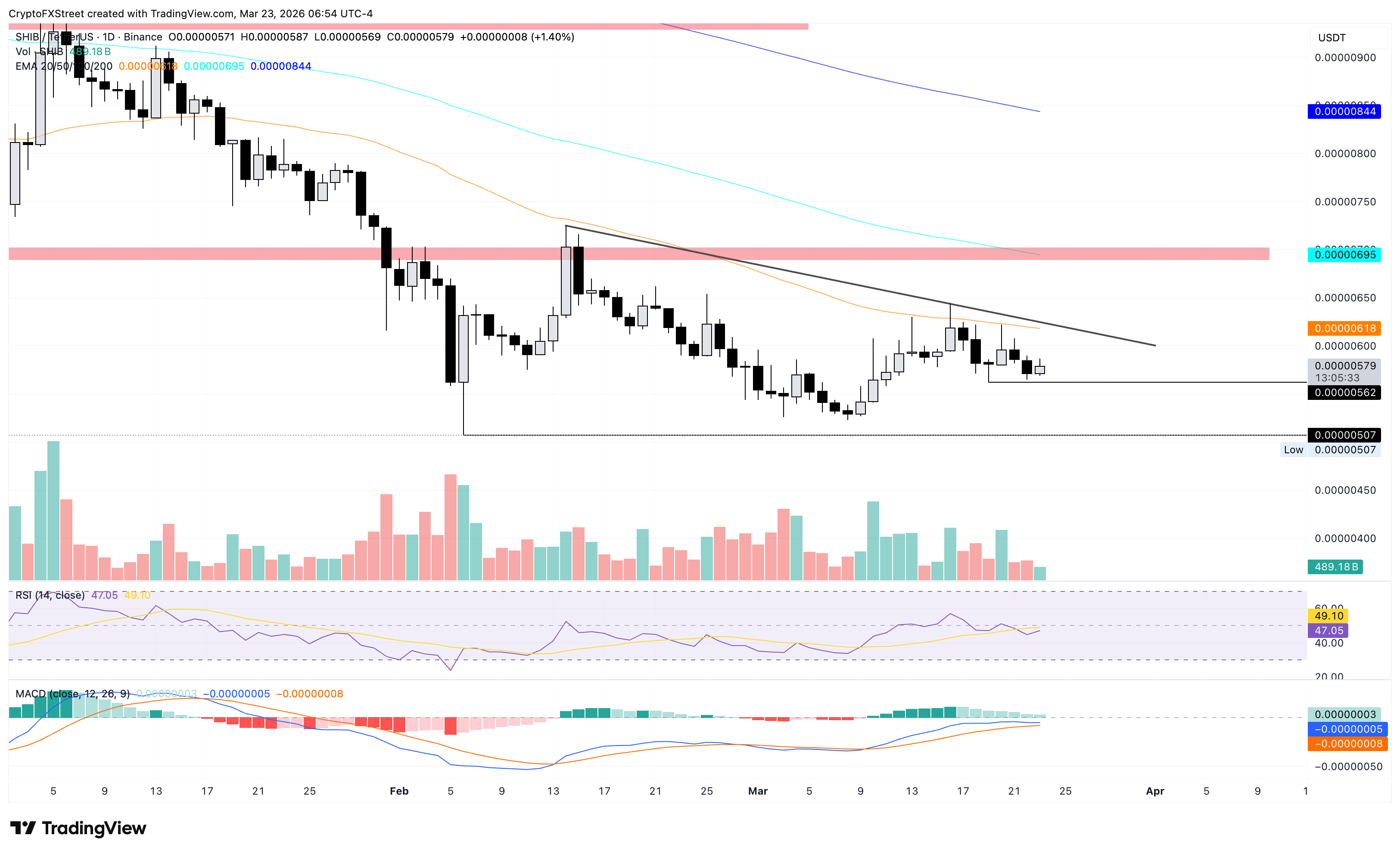 Shiba Inu sube ligeramente al momento de la publicación el lunes, tras dos días consecutivos de pérdidas. La moneda meme se mantiene por encima del mínimo de la semana anterior en 0.00000562$, limitando el riesgo a la baja hacia el mínimo del 6 de febrero en 0.00000507$.