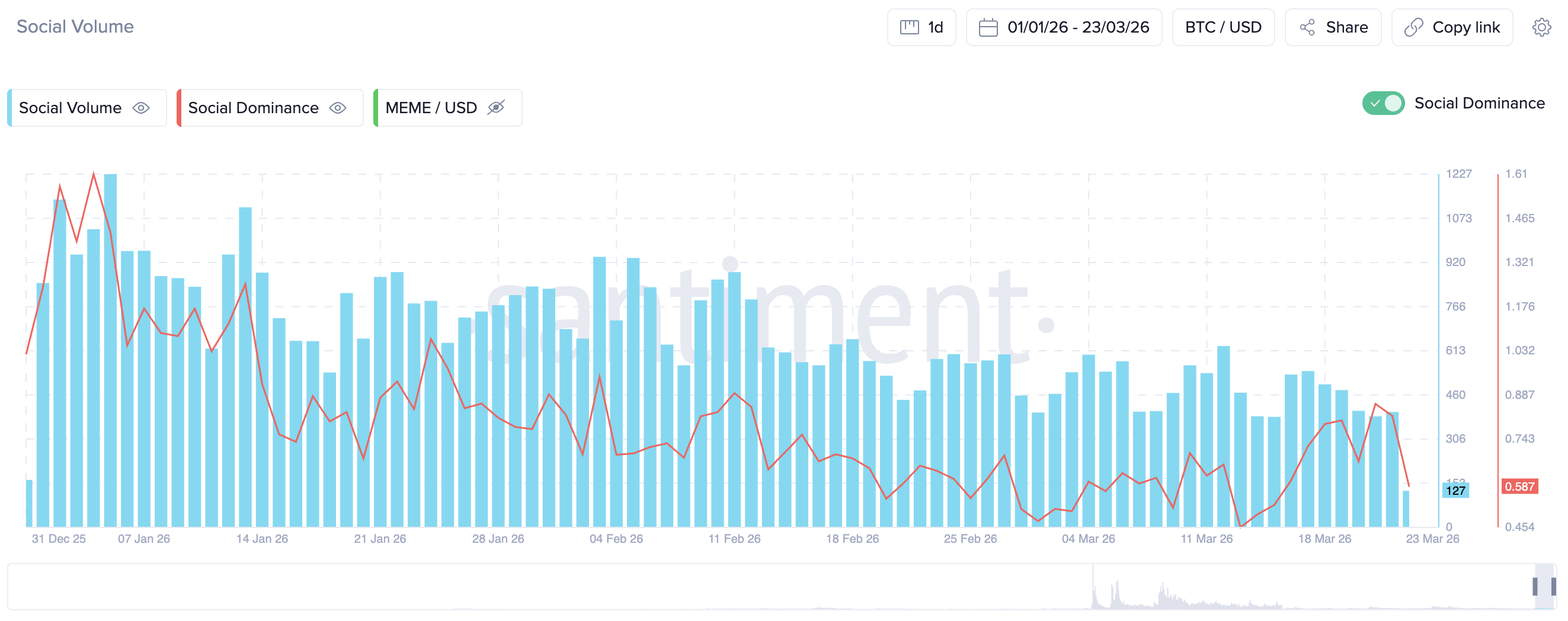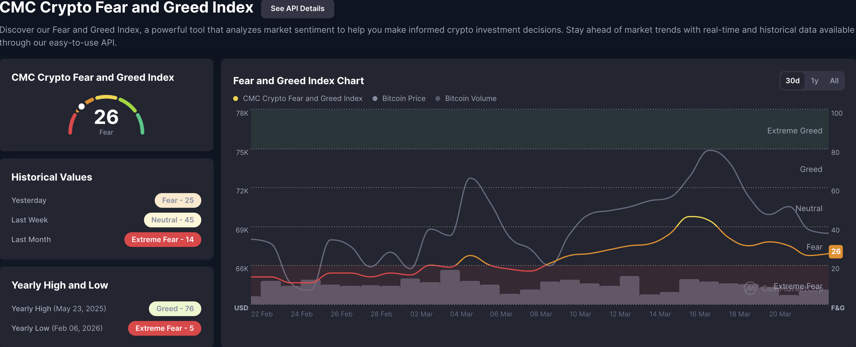 El menor interés en las monedas meme coincide con el deterioro del sentimiento general del mercado. El Índice de Miedo y Codicia de CoinMarketCap en 26 señala miedo entre los inversores, tras un rechazo de la región neutral en 45 el 16 de marzo.