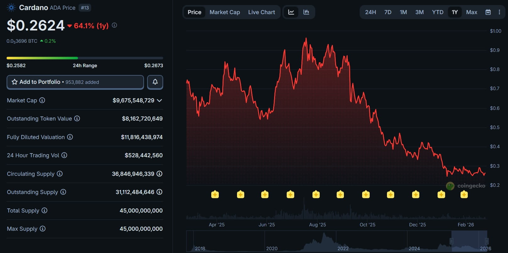 Sin embargo, la reacción posterior no ha sido favorable para Cardano. La noticia no derivó en un impulso alcista visible para $ADA, cuyo precio mantiene una pérdida acumulada de más de 20% en lo que va de 2026 y de 64% durante los últimos 12 meses. En otras palabras, el reconocimiento regulatorio no logró revertir el tono pesimista que domina entre operadores y participantes minoristas.