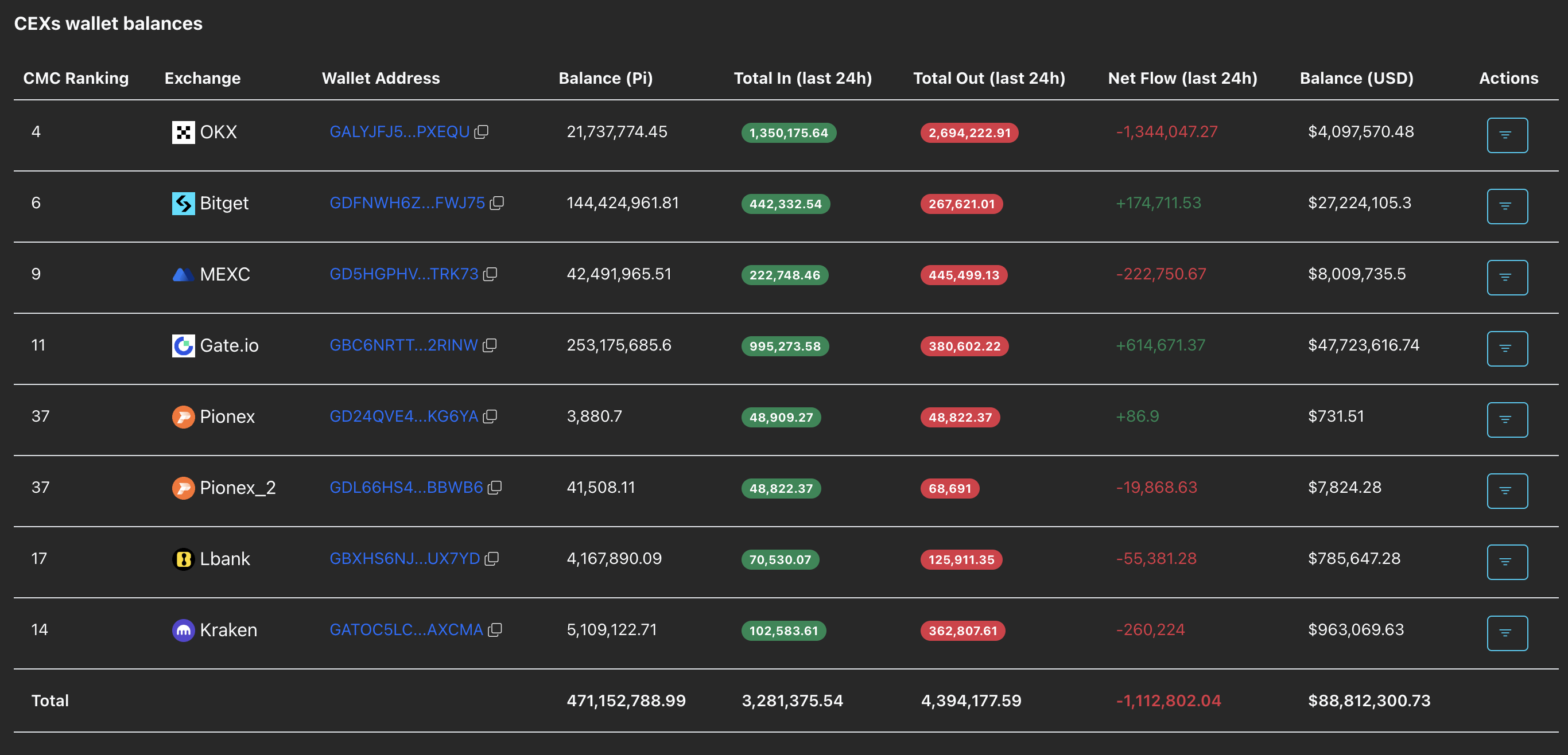 Los datos de PiScan muestran que los CEXs registraron 1.11 millones de tokens PI retirados en las últimas 24 horas, lo que indica una intensa compra que ha reducido la oferta disponible que alimentaba la presión de venta. Las salidas de OKX y Kraken reflejan una demanda constante en el mercado estadounidense.
