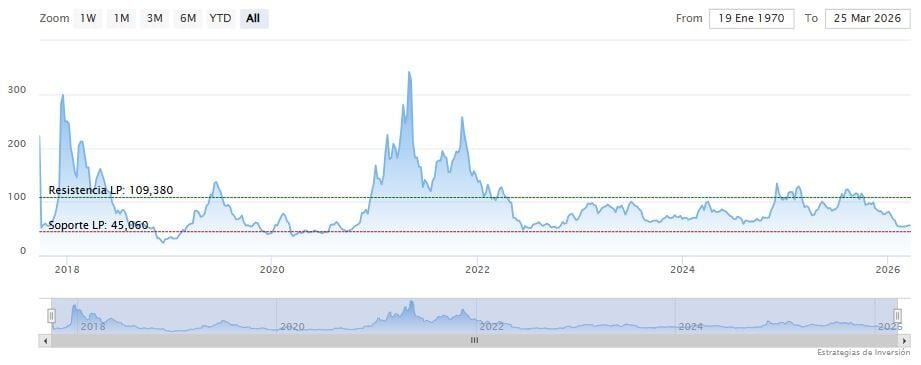El soporte a mediano y largo plazo se encuentra en los 45.06 dólares. Mientras, los indicadores de Ei se muestran mixtos.