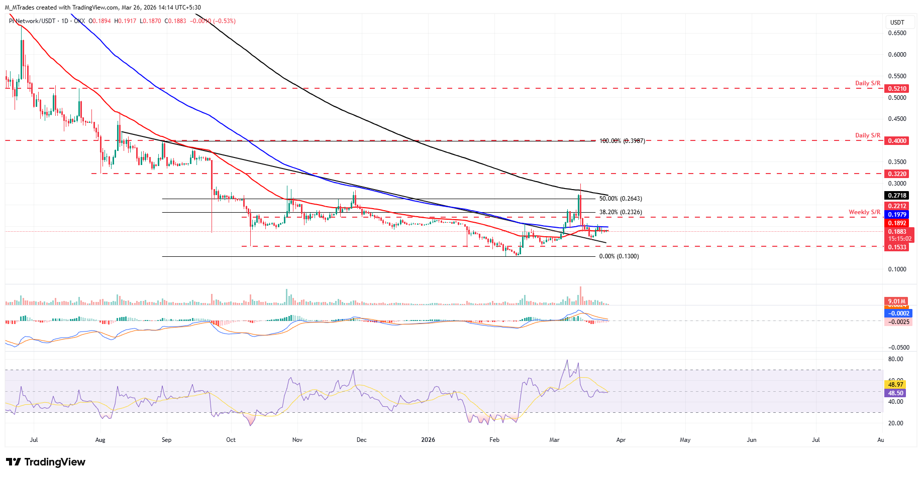 Pi Network se ha estado consolidando entre las medias móviles exponenciales (EMAs) de 50 y 100 días cerca de 0.18$ y 0.20$, respectivamente, desde el sábado, después de no lograr cerrar por encima de la EMA de 200 días cerca de 0.30$ el 13 de marzo.