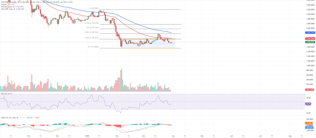 La resistencia inmediata se sitúa en el retroceso de Fibonacci del 23.6% desde el máximo de 3.402$ hasta el mínimo de 1.747$ en 2.138$, con el techo del canal cerca de 2.148$ actuando como un tope reforzante; un cierre diario por encima de esta zona abriría el camino hacia el retroceso del 38.2% en 2.380$ y la EMA de 50 días alrededor de 2.160$, que se convertiría en una base de soporte.