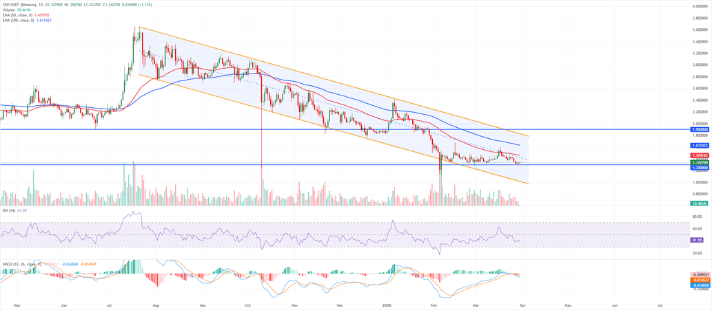 El precio de $XRP cotiza en 1.34$ el lunes. El sesgo a corto plazo se mantiene bajista ya que el precio se mantiene muy por debajo del punto medio del canal descendente y cotiza por debajo de las EMAs de 50 y 100 días, que continúan inclinándose a la baja y limitan los rebotes.