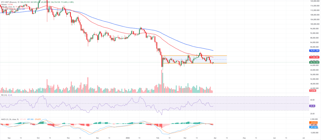 El soporte inmediato surge en el suelo del canal cerca de 65.800$, y un cierre diario por debajo de esta zona expondría la siguiente banda a la baja hacia 64.000$ y luego 62.000$.
