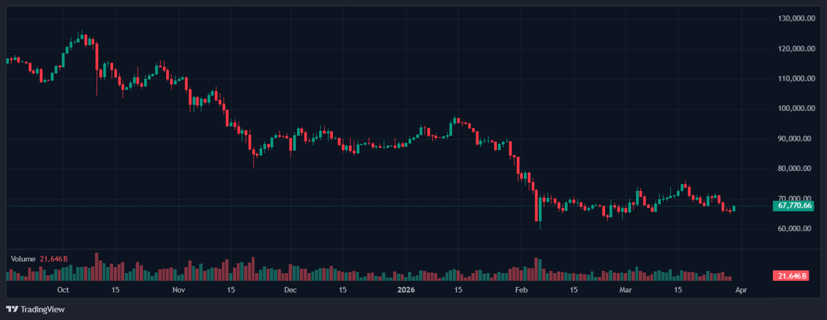 Logró rebotar casi de inmediato por encima de los $66.000 y pasó el fin de semana moviéndose lateralmente entre ese suelo y los $67.000. Esta mañana volvió a caer, marcando un nuevo mínimo mensual justo por debajo de los $65.000, antes de rebotar hasta casi los $68.000, donde volvió a frenarse tras las últimas novedades en el frente bélico.