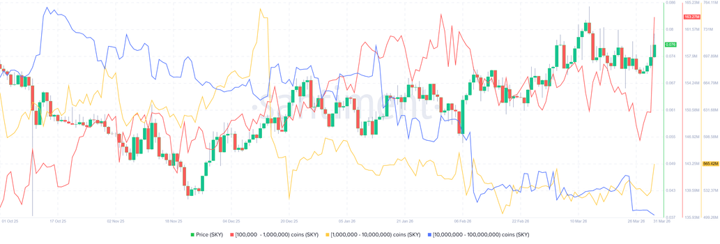 Esto muestra que el segundo grupo de ballenas podría haber caído presa de un evento de capitulación. En contraste, el primer conjunto de carteras aprovechó la oportunidad y acumuló Sky con descuento. Además, si esta compra continúa activamente, el precio de Sky podría extender el repunte en curso.