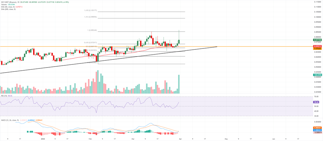El precio de Sky se negocia por encima de 0.077$ el martes. El sesgo a corto plazo es alcista ya que el precio se mantiene por encima de la línea de tendencia ascendente desde 0.041$ y cotiza por encima de la media móvil exponencial (EMA) de 50 días cerca de 0.070$, manteniendo el avance general intacto a pesar de la volatilidad reciente.