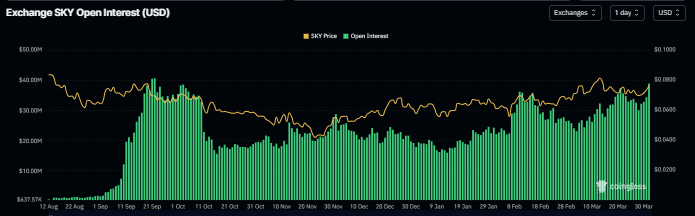 Los datos de CoinGlass muestran que el interés abierto de futuros en Sky en los intercambios alcanza los 38.84 millones de dólares el martes, desde 30.10 millones de dólares el sábado y acercándose a su máximo histórico de 40 millones de dólares. Un interés abierto creciente representa dinero nuevo o adicional entrando al mercado y nuevas compras, lo que podría alimentar el actual repunte del precio de $SKY.