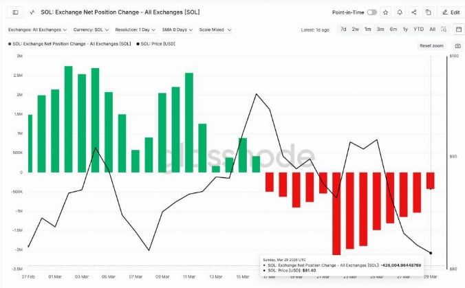 Los datos en la cadena de bloques muestran que la presión compradora que impulsó a $SOL hasta mediados de marzo se ha desvanecido al comenzar abril. El cambio en la posición neta de los exchanges, una medida del flujo de tokens dentro y fuera de las plataformas, mostró una fuerte acumulación entre el 17 y el 22 de marzo, alcanzando un máximo de aproximadamente -2.180.253 $SOL. Esta lectura negativa indicaba que las criptomonedas estaban saliendo de los exchanges, una señal clásica de compras al contado.