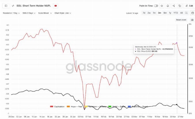 La NUPL de STH ha aumentado drásticamente desde una profunda capitulación de -0.95 el 5 de febrero hasta -0.27 el 25 de marzo. Actualmente se sitúa en torno a -0.40. Si bien sigue siendo negativa, los tenedores a corto plazo ahora registran pérdidas mucho menores que hace unas semanas.