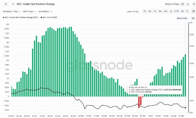 El único indicador que contradice el escenario bajista es la acumulación de posiciones por parte de los inversores a largo plazo. El valor del cambio neto de la posición de los inversores a largo plazo aumentó de 523.624 $SOL el 8 de marzo a 2.327.302 $SOL el 29 de marzo, un incremento de más del cuádruple. Se trata de participantes a medio y largo plazo que están adquiriendo posiciones de forma agresiva y podrían proporcionar un soporte psicológico para los inversores a corto plazo que estén considerando vender.
