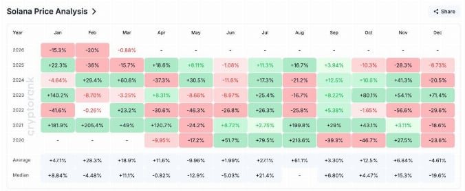 Abril ofrece escaso estímulo estacional. La rentabilidad media histórica de $SOL en abril se sitúa en el -0.82%, lo que lo convierte en uno de los meses más débiles registrados. Dado que 2026 ya ha roto varios patrones estacionales a la baja, basarse únicamente en los promedios históricos sería arriesgado.