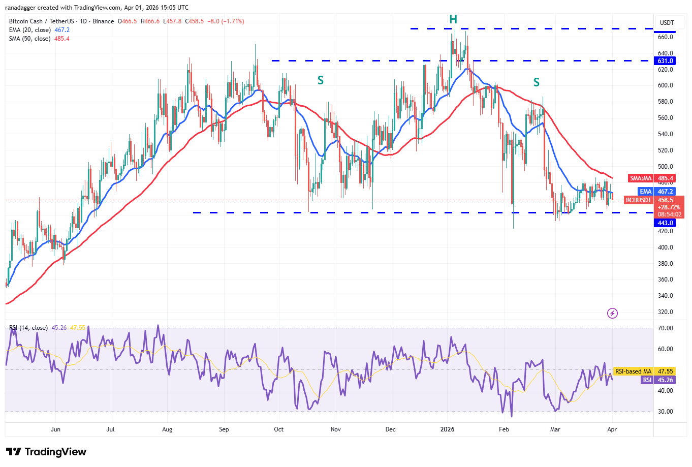 La incapacidad de los alcistas para superar el SMA de 50 días sugiere que los bajistas están activos en niveles superiores. Los vendedores intentarán fortalecer su posición tirando el precio de $BCH por debajo del nivel de 443 dólares. Si logran hacerlo, el par $BCH/$USDT completará un patrón bajista de cabeza y hombros. Esto abre las puertas a una caída hasta el nivel de 375 dólares.