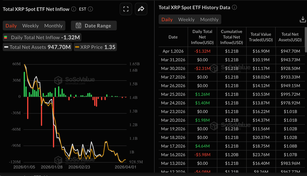 El interés en los fondos cotizados en bolsa (ETF) de $XRP se ha deteriorado aún más, como lo evidencian salidas moderadas de 1.32 millones de dólares el miércoles tras una actividad contenida el martes. Los ETF de $XRP también registraron salidas de aproximadamente 2.3 millones de dólares el lunes, minando el apetito por el riesgo.