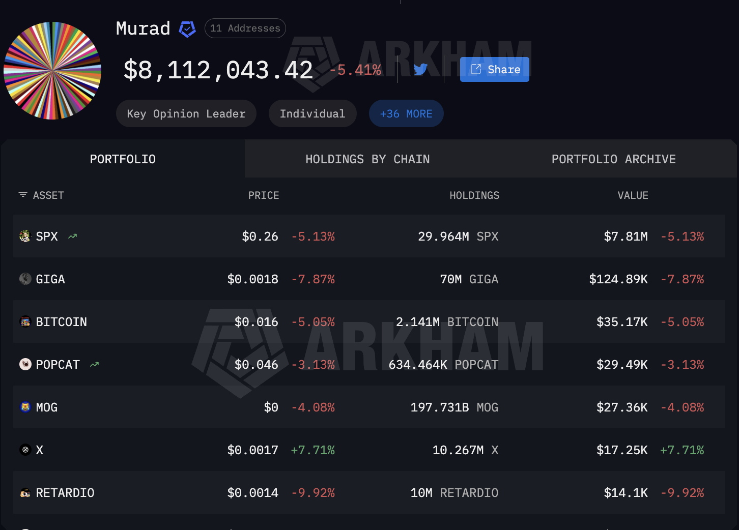 Las billeteras públicas etiquetadas de Mahmudov, rastreadas bajo la entidad “Muststopmurad” por Arkham Intelligence, actualmente poseen aproximadamente 29,964 millones de $SPX, valorados en alrededor de USD 7,79 millones.