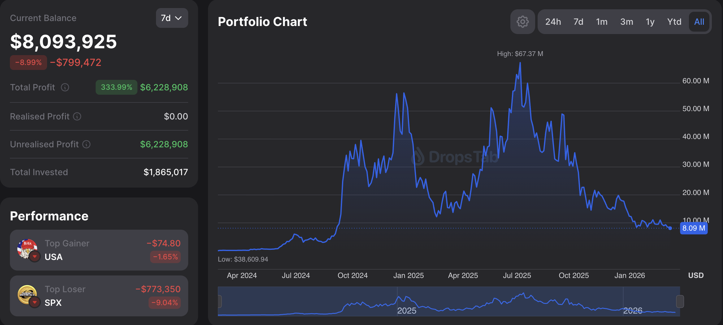 La caída desde entonces equivale a una pérdida no realizada de aproximadamente USD 60 millones, ya que el sector de las memecoins en general, incluyendo $SPX, corrigió más de 80% desde sus máximos.